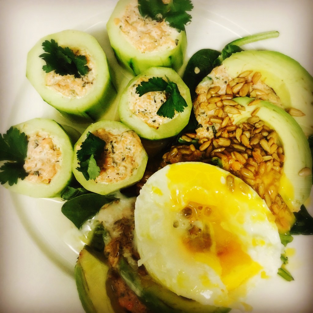 - On the side, crack an egg in a cup, poke it with fork and microwave it for no more than 30 sec. Place the baby spinach, sliced avocados and place the egg over it. Sprinkle sunflower seeds.