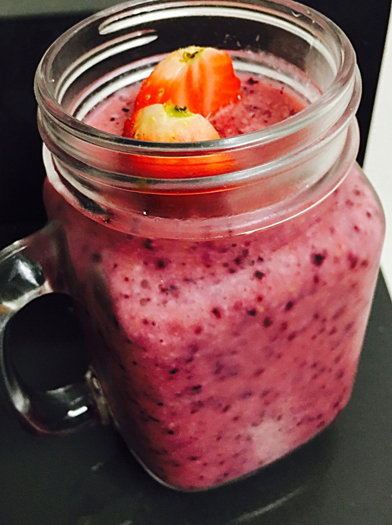 A sweet, healthy and yummy smoothie perfect for your breakfast or just for a snack – this smoothie packs all the colorful goodies together including fresh fruit, greek yogurt and my favorite, almonds. Both almonds and blueberries are known to improve memory function, and the amazing strawberry-raspberry combo helps keep your heart healthy, thus making this smoothie an amazing start of your day! Sluuuurp!!