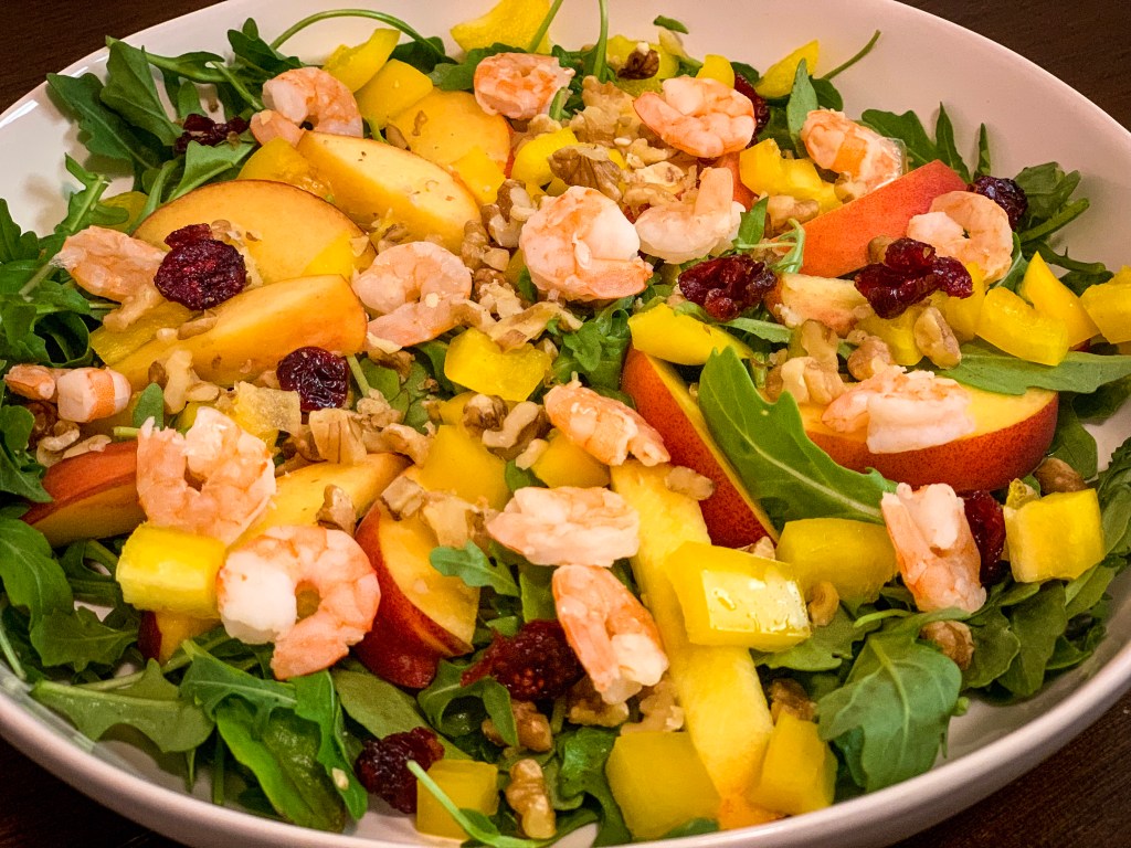 - Place the arugula, sliced peaches, diced yellow peppers, chopped walnuts and cranberries, feta cheese (optional), and cooked shrimp (optional) in a large bowl.